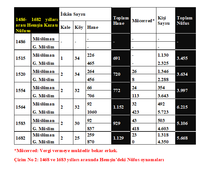 Diğerlerini de şema da göreceğiniz üzere Hemşin nüfusunun 1515 ila 1682 yılları arasındaki 167 yılda 3.455 kişiden 5.668 kişiye yükseldiği görülmektedir.