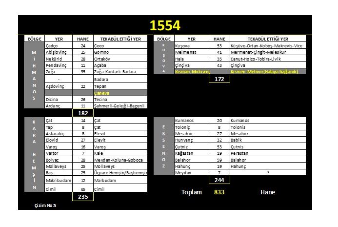 1554 yılı tahririnde Hemşin (Mihmanos), Kuş ova, Eksanos ve Kara Hemşin şeklinde sıralanan Hemşin nahiyelerindeki köy sayısı 31 olarak verilmiştir.