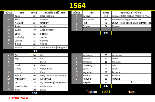 1564 kayıtlarındaki defterde yer alan Hemşin kazası kayıtları incelendiğinde kaza dâhilinde 30 köy ve 2 mahallede 1534 hane, 18 zemin ve 57 değirmenin bulunduğu görülmektedir. Bu defterde de kazanın 4 nahiyeye bölünmüş olduğu görülmektedir. Bunlar Kara Hemşin, Eksanos, Kuş ova ve Mihmanos şeklinde sıralanmaktadır. Adı ilk defa kayıtlara geçen Mihmanos’un önceki tahrirlerde Hemşin merkez nahiyesi yerinde bulunduğu köylerinden anlaşılmaktadır.