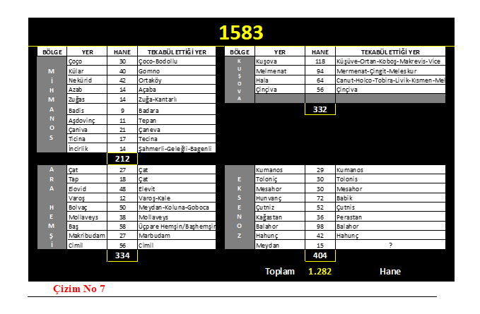 Tablo da ayırıldı ama 1554 kayıtlarında ayrı kaydedilmiştir. Bu tarihten sonra tutulmuş diğer 3 defterde ise Kuş Ova nahiyesi diğer nahiyeler gibi ayrı başlık altında yazılmıştır.